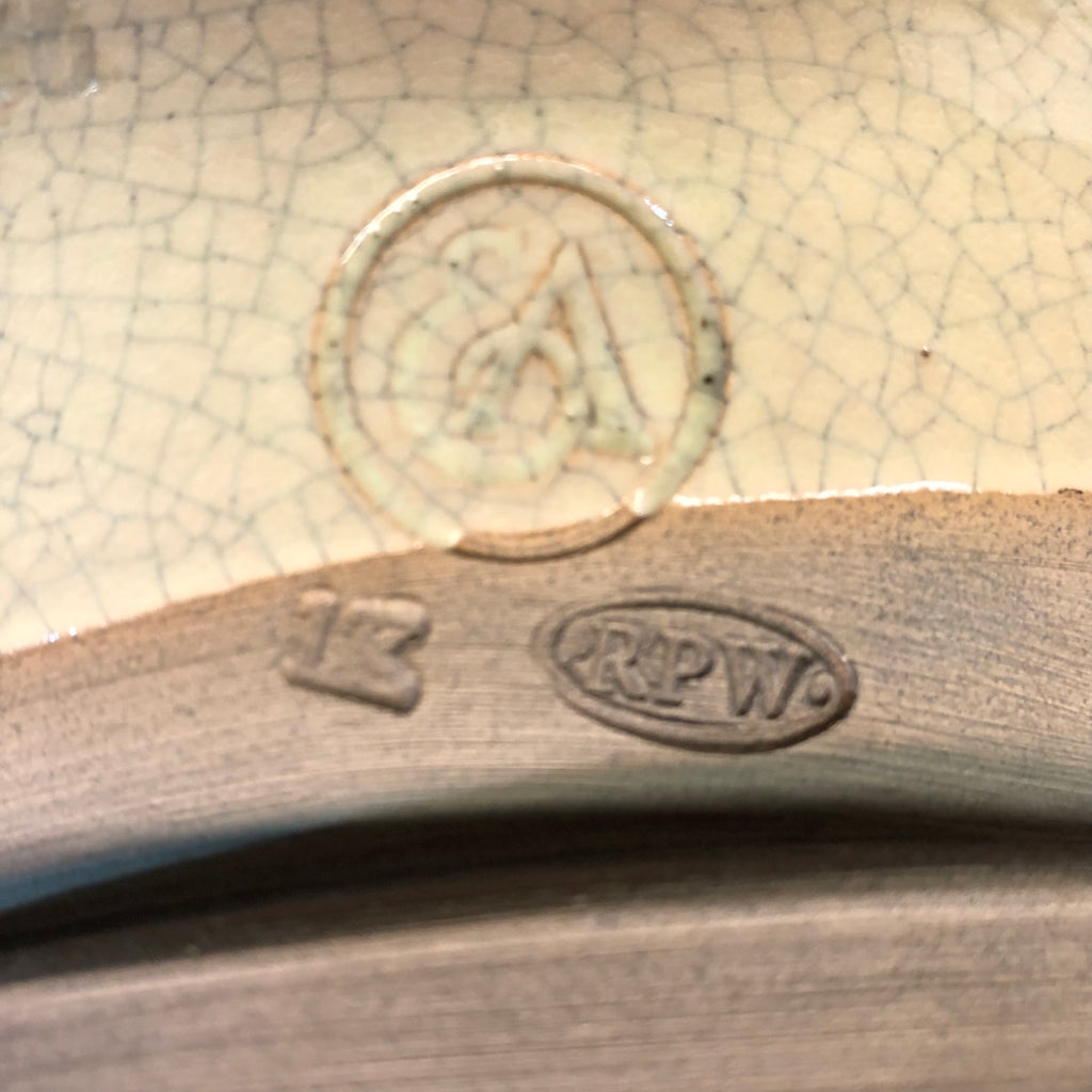 Spectacular pottery canister made for Ethan Allen by RPW potters. Shades of tan and ivory with a conch shell shaped handle.