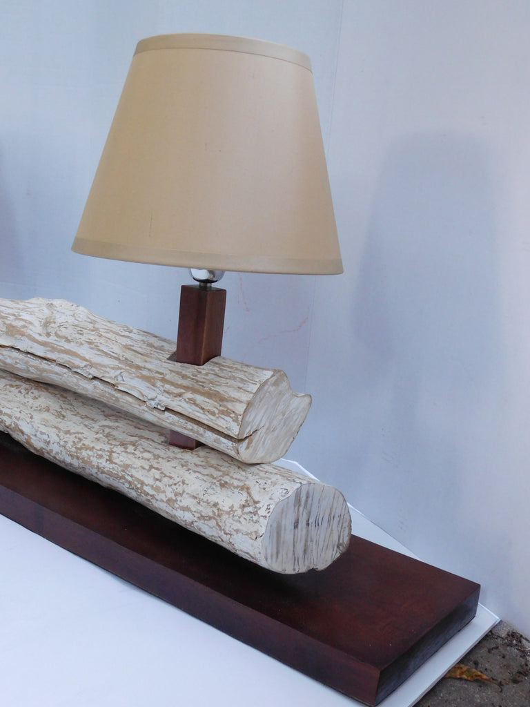 Unique driftwood look long console table lamp with double sockets. Whitewashed wood on cherry finished wood base.