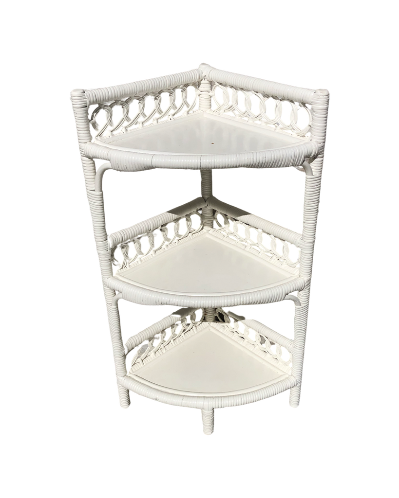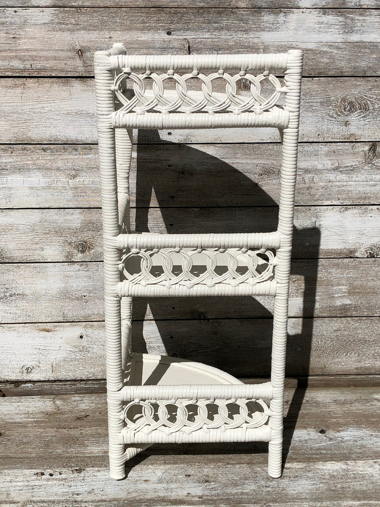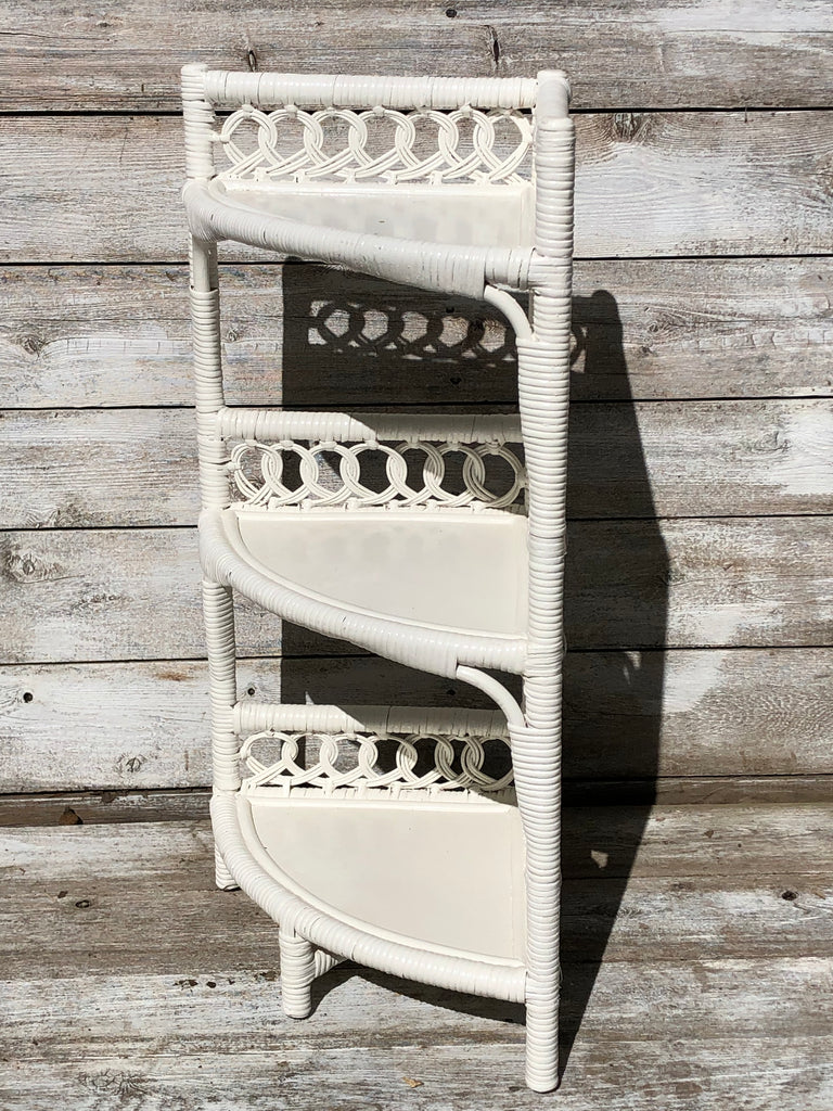 Lovely 3-tiered white wicker bathroom vanity shelf. Measures 17.5”w x 12.5d x 30.25h. In excellent condition.