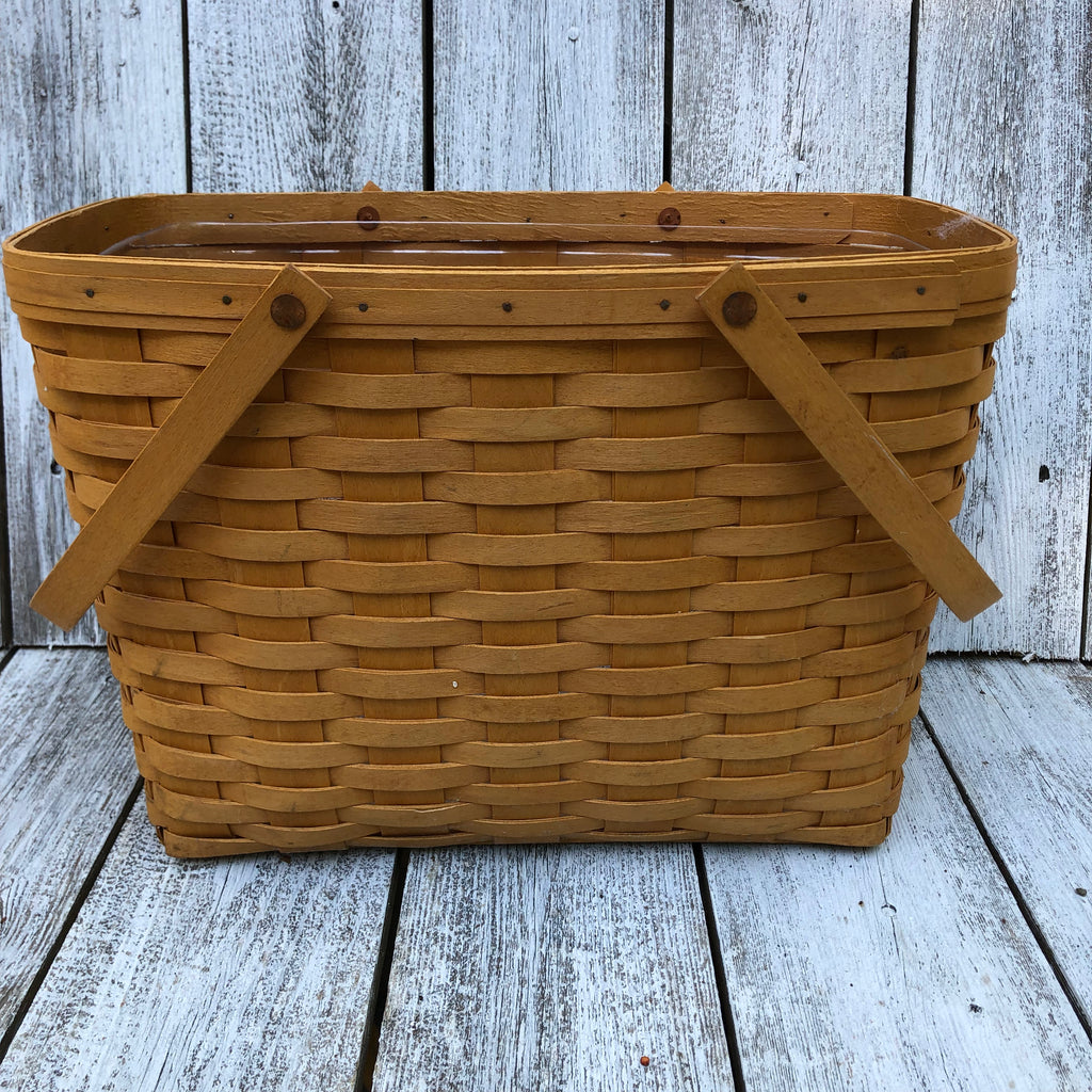 Lovely and functional tall rectangular Longaberger basket with handles and liner. Signed and dated 2000.