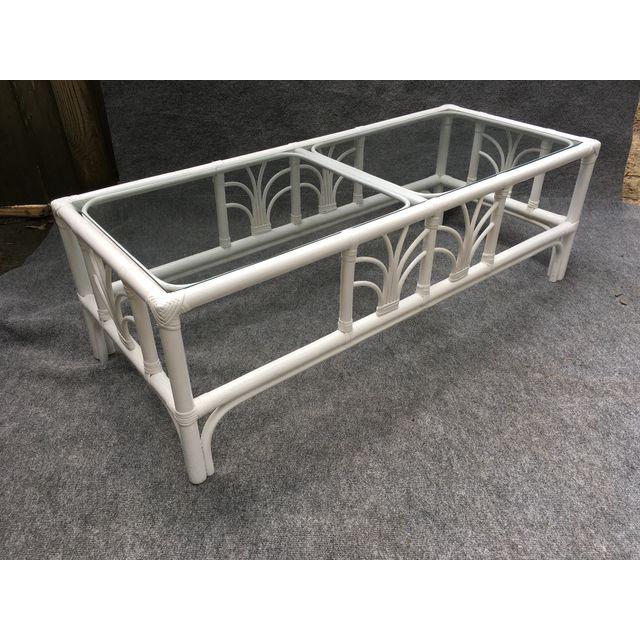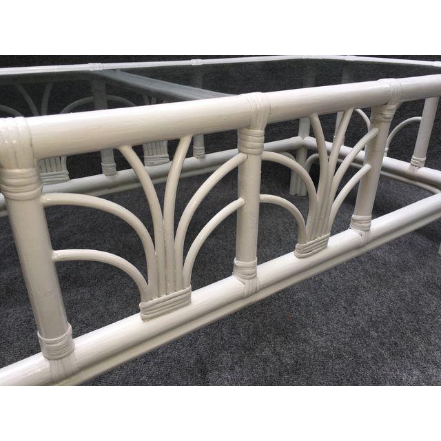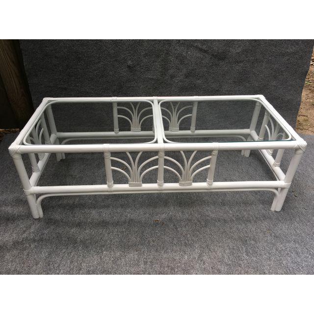 Vintage clear glass top rattan cocktail table newly painted a crisp satin white.